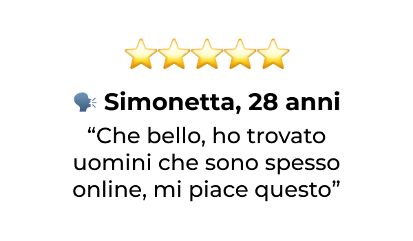 PROVA YOOPPE Ecco come Martina ha ricominciato a flirtare: “Alcune delle mie amiche hanno iniziato a usare Yooppe perché anche altre donne lo stavano usando. Così una sera mi hanno chiesto se volevo provare. Ero timida, impacciata, non sapevo più cosa volesse dire flirtare con qualcuno, erano almeno 10 anni che non lo facevo più. Mi sentivo come se fossi rimasta indietro e pensavo, oggi i metodi per attaccare bottone saranno cambiati, e se fraintendo un messaggio o qualcuno non mi risponde? Alla fine ho provato, non ho frainteso nessun messaggio, tutti gli uomini a cui ho scritto hanno risposto e la conversazione è andata avanti, mi è sembrato come se nulla fosse cambiato.” PROVA YOOPPE Recensioni in tempo reale di Yooppe: PROVA YOOPPE Ecco come Martina ha ricominciato a flirtare: “Alcune delle mie amiche hanno iniziato a usare Yooppe perché anche altre donne lo stavano usando. Così una sera mi hanno chiesto se volevo provare. Ero timida, impacciata, non sapevo più cosa volesse dire flirtare con qualcuno, erano almeno 10 anni che non lo facevo più. Mi sentivo come se fossi rimasta indietro e pensavo, oggi i metodi per attaccare bottone saranno cambiati, e se fraintendo un messaggio o qualcuno non mi risponde? Alla fine ho provato, non ho frainteso nessun messaggio, tutti gli uomini a cui ho scritto hanno risposto e la conversazione è andata avanti, mi è sembrato come se nulla fosse cambiato.” PROVA YOOPPE Recensioni in tempo reale di Yooppe: PROVA YOOPPE