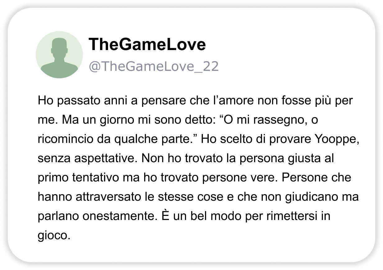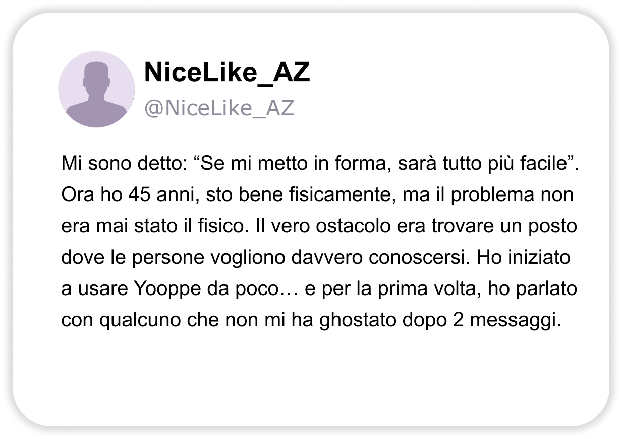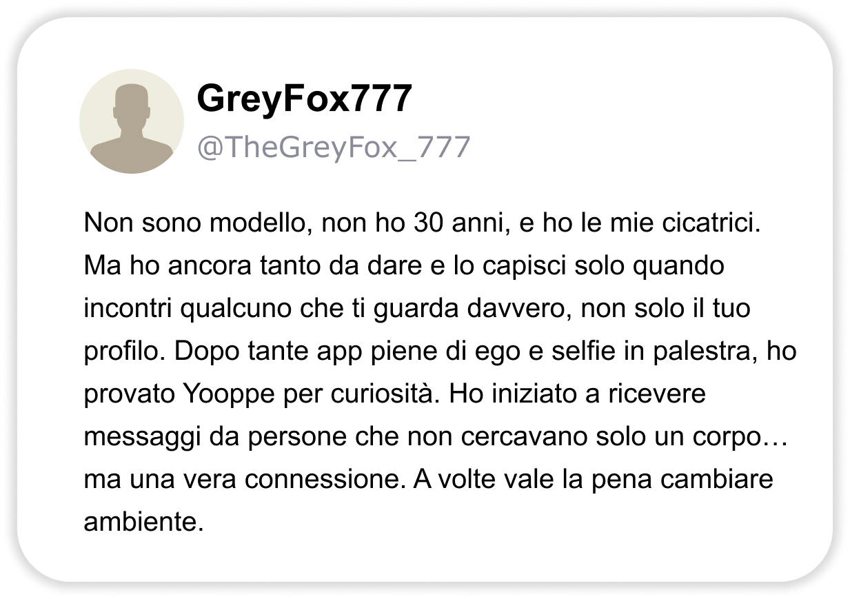 CHAT VERE E DOVE TROVARLE: ECCO IL SITO DI INCONTRI PIÙ UTILIZZATO DELL’ANNO DALLE DONNE. “Oltre 10.000 persone hanno trovato connessioni autentiche su Yooppe. Scopriamo perché parlano tutti di questo sito di incontri.” Stanco delle solite chat? Non sei il solo. Se hai più di 40 anni, un lavoro, magari una separazione alle spalle o semplicemente la sensazione che “non è mai il momento giusto”, allora probabilmente sai già quanto può essere frustrante cercare qualcosa di vero nel mondo degli incontri online. Swipe infiniti, conversazioni che si spengono dopo due messaggi, profili che sembrano finti… poi succede che senti parlare di Yooppe. Un sito di incontri pensato per chi ha voglia di tornare a conoscersi veramente. ENTRA SU YOOPPE Perché è così popolare 🔥 La piattaforma di incontri più recensita positivamente in Italia nell’ultimo anno. 👥 200.000+ utenti attivi ogni mese, persone come te, che cercano qualcosa di reale. 📈 Match di qualità 3 volte superiori alla media. Le statistiche confermano che chi entra su Yooppe ci resta. Perché Yooppe è diverso ✅ Niente swipe a vuoto: su Yooppe le connessioni si basano su reali affinità, non su apparenze. ✅ Persone con intenzioni serie: uomini e donne tra i 30 e i 60 anni che cercano relazioni vere. ✅ Interazione autentica: conosci le persone senza algoritmi forzati, sei tu a decidere. Le recensioni contano Yooppe non è una moda passeggera. Con oltre 10.000 recensioni positive e una valutazione media di 4.8 si è conquistato la fiducia di migliaia di persone che cercavano (e hanno trovato) qualcosa di reale, serio e sincero. E la cosa più interessante? Il 68% degli utenti dichiara di aver iniziato una frequentazione vera entro il primo mese. ENTRA SU YOOPPE Su Yooppe non c’è fretta Qui conta di più cosa dici che quanti like ricevi. Yooppe è uno spazio accogliente, dove puoi raccontarti senza maschere, con la libertà di essere te stesso. Le persone non sono lì per giudicare, ma per ascoltare con attenzione e curiosità. Qui ognuno può scegliere il proprio ritmo, fermarsi quando serve, tornare quando vuole. Perché su Yooppe non esiste la fretta, esiste il tempo che serve per essere veri. CHAT VERE E DOVE TROVARLE: ECCO IL SITO DI INCONTRI PIÙ UTILIZZATO DELL’ANNO DALLE DONNE. “Oltre 10.000 persone hanno trovato connessioni autentiche su Yooppe. Scopriamo perché parlano tutti di questo sito di incontri.” Stanco delle solite chat? Se hai più di 40 anni, un lavoro, magari una separazione alle spalle o semplicemente la sensazione che “non è mai il momento giusto”, allora probabilmente sai già quanto può essere frustrante cercare qualcosa di vero nel mondo degli incontri online. Swipe infiniti, conversazioni che si spengono dopo due messaggi, profili che sembrano finti… poi succede che senti parlare di Yooppe. Un sito di incontri pensato per chi ha voglia di tornare a conoscersi veramente. ENTRA SU YOOPPE Perché è così popolare 🔥 La piattaforma di incontri più recensita positivamente in Italia nell’ultimo anno. 👥 200.000+ utenti attivi ogni mese, persone come te, che cercano qualcosa di reale. 📈 Match di qualità 3 volte superiori alla media. Le statistiche confermano che chi entra su Yooppe ci resta. Perché Yooppe è diverso ✅ Niente swipe a vuoto: su Yooppe le connessioni si basano su reali affinità, non su apparenze. ✅ Persone con intenzioni serie: uomini e donne tra i 30 e i 60 anni che cercano relazioni vere. ✅ Interazione autentica: conosci le persone senza algoritmi forzati, sei tu a decidere. Le recensioni contano Yooppe non è una moda passeggera. Con oltre 10.000 recensioni positive e una valutazione media di 4.8 si è conquistato la fiducia di migliaia di persone che cercavano (e hanno trovato) qualcosa di reale, serio e sincero. E la cosa più interessante? Il 68% degli utenti dichiara di aver iniziato una frequentazione vera entro il primo mese. ENTRA SU YOOPPE Su Yooppe non c’è fretta Qui conta di più cosa dici che quanti like ricevi. Yooppe è uno spazio accogliente, dove puoi raccontarti senza maschere, con la libertà di essere te stesso. Le persone non sono lì per giudicare, ma per ascoltare con attenzione e curiosità. Qui ognuno può scegliere il proprio ritmo, fermarsi quando serve, tornare quando vuole. Perché su Yooppe non esiste la fretta, esiste il tempo che serve per essere veri.