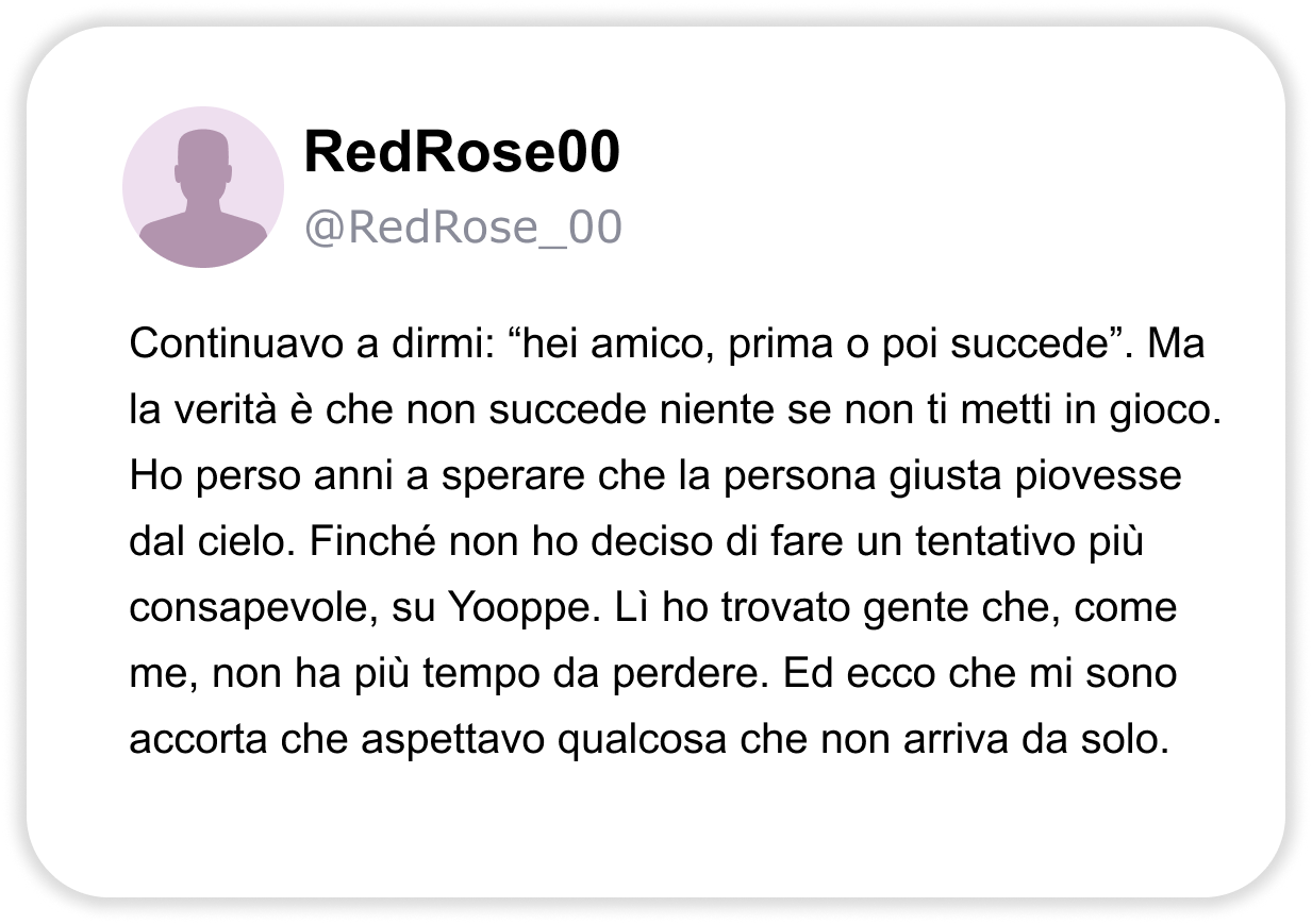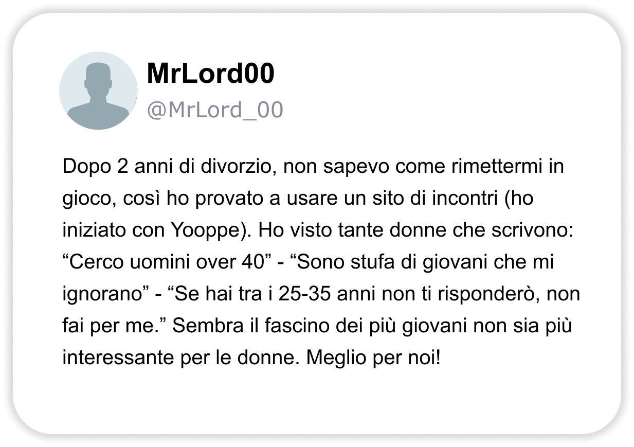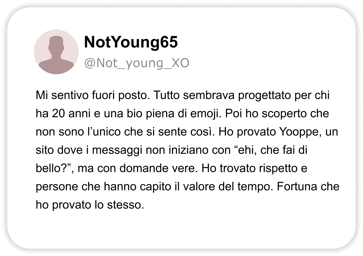 CHAT VERE E DOVE TROVARLE: ECCO IL SITO DI INCONTRI PIÙ UTILIZZATO DELL’ANNO DALLE DONNE. “Oltre 10.000 persone hanno trovato connessioni autentiche su Yooppe. Scopriamo perché parlano tutti di questo sito di incontri.” Stanco delle solite chat? Non sei il solo. Se hai più di 40 anni, un lavoro, magari una separazione alle spalle o semplicemente la sensazione che “non è mai il momento giusto”, allora probabilmente sai già quanto può essere frustrante cercare qualcosa di vero nel mondo degli incontri online. Swipe infiniti, conversazioni che si spengono dopo due messaggi, profili che sembrano finti… poi succede che senti parlare di Yooppe. Un sito di incontri pensato per chi ha voglia di tornare a conoscersi veramente. ENTRA SU YOOPPE Perché è così popolare 🔥 La piattaforma di incontri più recensita positivamente in Italia nell’ultimo anno. 👥 200.000+ utenti attivi ogni mese, persone come te, che cercano qualcosa di reale. 📈 Match di qualità 3 volte superiori alla media. Le statistiche confermano che chi entra su Yooppe ci resta. Perché Yooppe è diverso ✅ Niente swipe a vuoto: su Yooppe le connessioni si basano su reali affinità, non su apparenze. ✅ Persone con intenzioni serie: uomini e donne tra i 30 e i 60 anni che cercano relazioni vere. ✅ Interazione autentica: conosci le persone senza algoritmi forzati, sei tu a decidere. Le recensioni contano Yooppe non è una moda passeggera. Con oltre 10.000 recensioni positive e una valutazione media di 4.8 si è conquistato la fiducia di migliaia di persone che cercavano (e hanno trovato) qualcosa di reale, serio e sincero. E la cosa più interessante? Il 68% degli utenti dichiara di aver iniziato una frequentazione vera entro il primo mese. ENTRA SU YOOPPE Su Yooppe non c’è fretta Qui conta di più cosa dici che quanti like ricevi. Yooppe è uno spazio accogliente, dove puoi raccontarti senza maschere, con la libertà di essere te stesso. Le persone non sono lì per giudicare, ma per ascoltare con attenzione e curiosità. Qui ognuno può scegliere il proprio ritmo, fermarsi quando serve, tornare quando vuole. Perché su Yooppe non esiste la fretta, esiste il tempo che serve per essere veri. CHAT VERE E DOVE TROVARLE: ECCO IL SITO DI INCONTRI PIÙ UTILIZZATO DELL’ANNO DALLE DONNE. “Oltre 10.000 persone hanno trovato connessioni autentiche su Yooppe. Scopriamo perché parlano tutti di questo sito di incontri.” Stanco delle solite chat? Se hai più di 40 anni, un lavoro, magari una separazione alle spalle o semplicemente la sensazione che “non è mai il momento giusto”, allora probabilmente sai già quanto può essere frustrante cercare qualcosa di vero nel mondo degli incontri online. Swipe infiniti, conversazioni che si spengono dopo due messaggi, profili che sembrano finti… poi succede che senti parlare di Yooppe. Un sito di incontri pensato per chi ha voglia di tornare a conoscersi veramente. ENTRA SU YOOPPE Perché è così popolare 🔥 La piattaforma di incontri più recensita positivamente in Italia nell’ultimo anno. 👥 200.000+ utenti attivi ogni mese, persone come te, che cercano qualcosa di reale. 📈 Match di qualità 3 volte superiori alla media. Le statistiche confermano che chi entra su Yooppe ci resta. Perché Yooppe è diverso ✅ Niente swipe a vuoto: su Yooppe le connessioni si basano su reali affinità, non su apparenze. ✅ Persone con intenzioni serie: uomini e donne tra i 30 e i 60 anni che cercano relazioni vere. ✅ Interazione autentica: conosci le persone senza algoritmi forzati, sei tu a decidere. Le recensioni contano Yooppe non è una moda passeggera. Con oltre 10.000 recensioni positive e una valutazione media di 4.8 si è conquistato la fiducia di migliaia di persone che cercavano (e hanno trovato) qualcosa di reale, serio e sincero. E la cosa più interessante? Il 68% degli utenti dichiara di aver iniziato una frequentazione vera entro il primo mese. ENTRA SU YOOPPE Su Yooppe non c’è fretta Qui conta di più cosa dici che quanti like ricevi. Yooppe è uno spazio accogliente, dove puoi raccontarti senza maschere, con la libertà di essere te stesso. Le persone non sono lì per giudicare, ma per ascoltare con attenzione e curiosità. Qui ognuno può scegliere il proprio ritmo, fermarsi quando serve, tornare quando vuole. Perché su Yooppe non esiste la fretta, esiste il tempo che serve per essere veri.